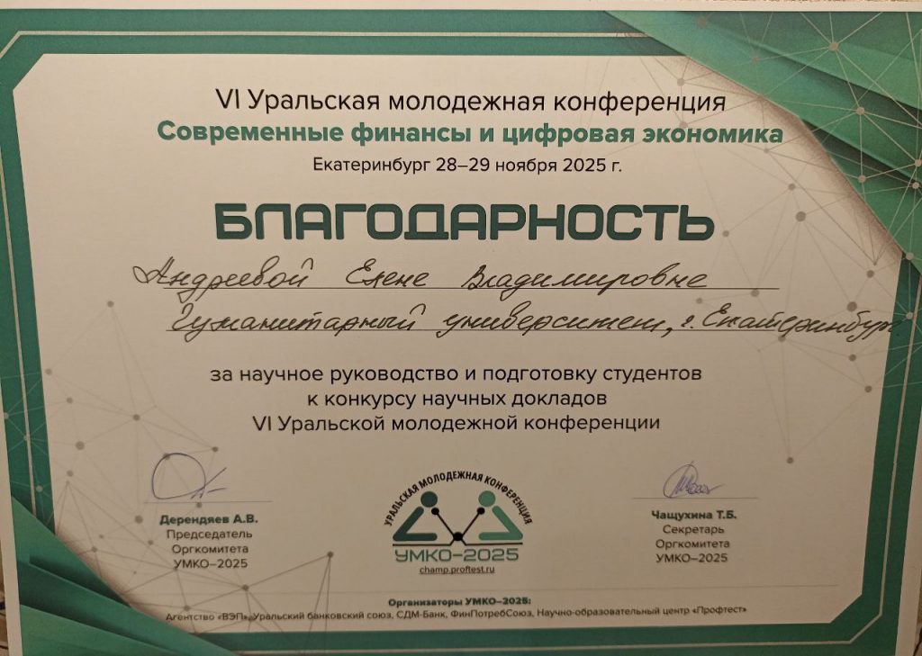 Вчера в ходе Шестой Уральской молодёжной конференции «Современные финансы и цифровая экономика» УМКО-2025 участники Патриотического клуба «Историческая память» и студенты направлений подготовки «Экономика» и «Менеджмент» факультета бизнеса и управления Гуманитарного университета приняли участие в конкурсе по теме «Финансы» среди 40 студенческих команд всей России.