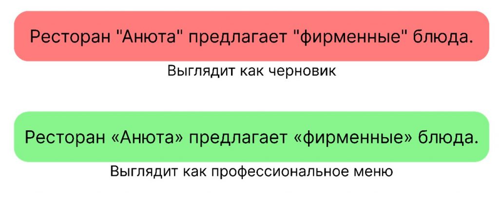 - правильные кавычки-ёлочки избавляют мозг от «визуального шума», позволяя сосредоточиться на сути;