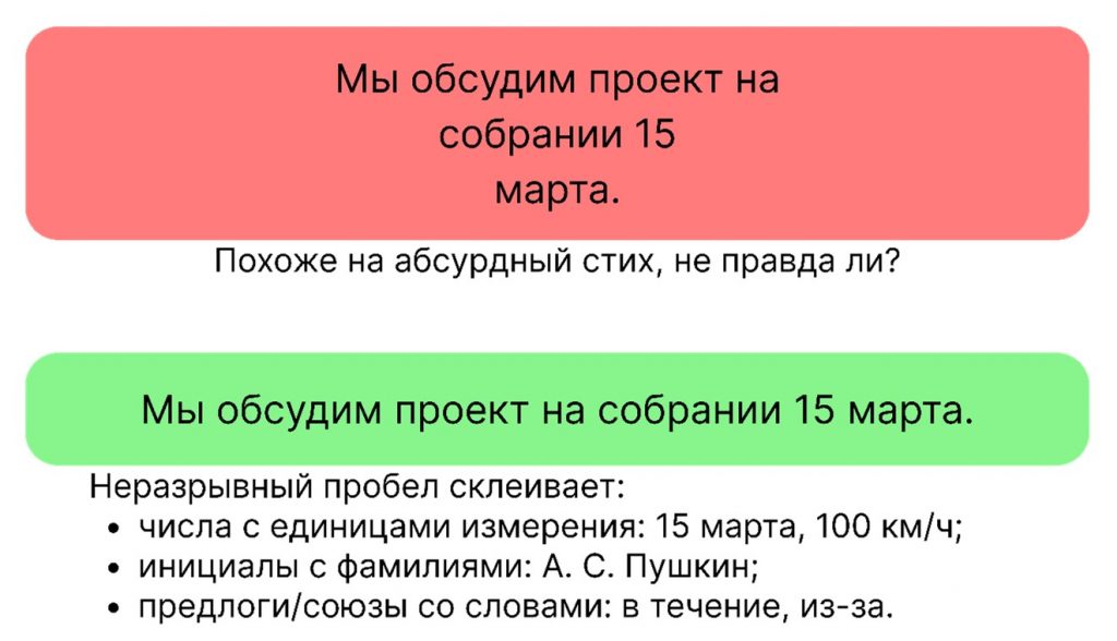 Почему это важно: пробелы не дают словам и числам разрываться в самых неподходящих местах, сохраняя аккуратный вид текста и избавляя читателя от излишней концентрации на строчках при чтении.