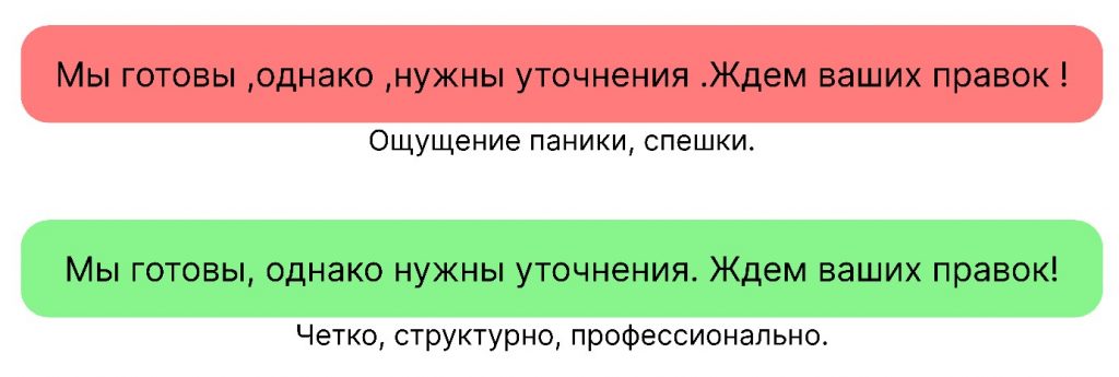 - грамотные пробелы вокруг знаков препинания устраняют подсознательное раздражение от хаоса;