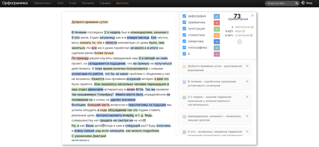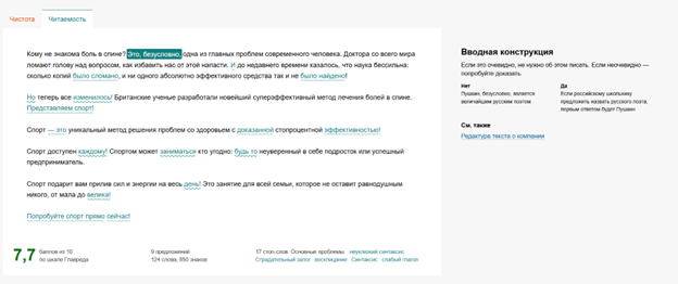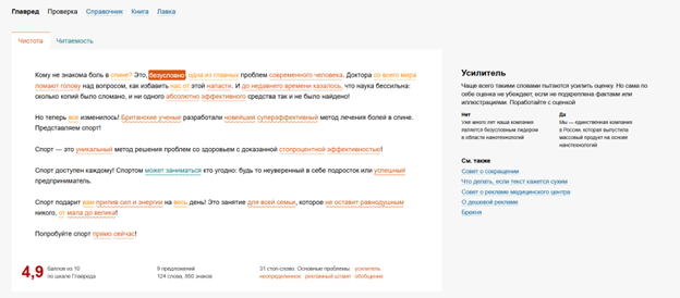 Это бесплатный сервис, который помогает «почистить» текст. Он ищет слова-паразиты, штампы, канцеляриты и сложные синтаксические конструкции. Подсвеченные фразы сопровождаются пояснением, почему их лучше заменить. Дополнительно можно проверить текст на читаемость — сервис покажет, насколько легко его воспринимать.