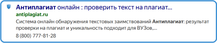 В Яндекс Браузере обращайте внимание на правильное написание сайта — antiplagiat.ru, а также на единый номер 8 (800) 777-81-28: