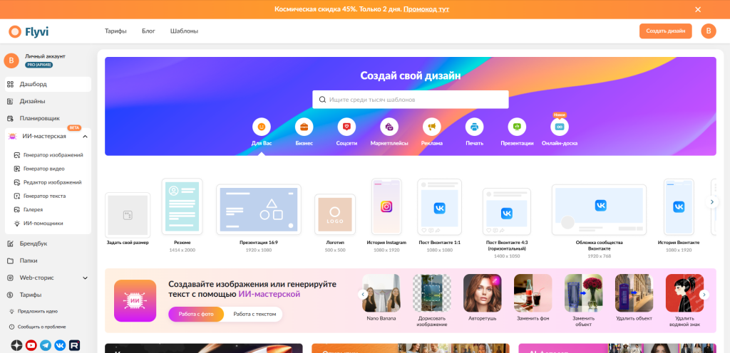 Вместо того, чтобы мучительно выравнивать картинки и подбирать шрифты в стандартном редакторе, откройте Flyvi. Сервис предлагает готовые шаблоны, анимацию и возможность работать над слайдами вместе с одногруппниками. Идеально подходит для защиты проектов по менеджменту, рекламе или психологии. В общем, везде, где важна визуальная подача. Если вы хотите сделать дизайн самостоятельно, то Flyvi предоставляет большой набор инструментов и для этой задачи. Бесплатная версия покрывает все базовые потребности студента.