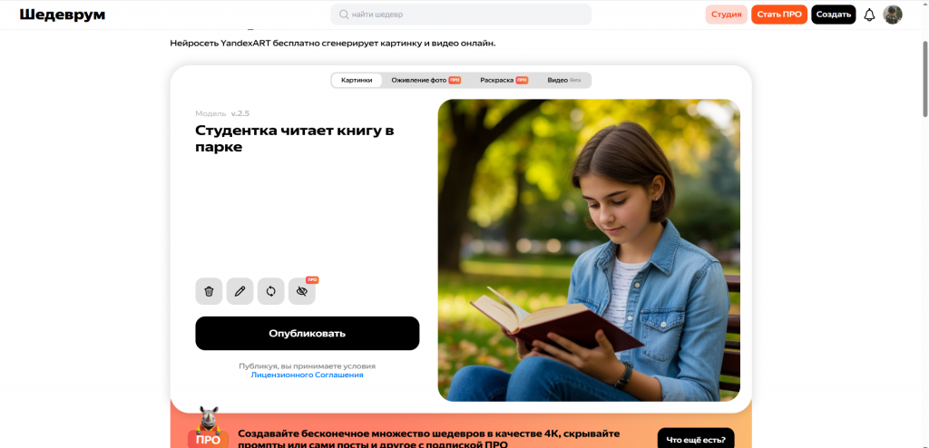 Приложение от «Яндекса» генерирует изображения по текстовому описанию. Написали «студентка читает книгу в парке» – получили картинку для презентации или вдохновения. Шедеврум полностью бесплатен, работает без ограничений и интерфейс в нем на русском языке. Можно выбрать соотношение сторон и ИИ-модель, которая сгенерирует вашу картинку. Идеально для творческих проектов, обложек для статей или просто для визуализации абстрактных идей в любых направлениях.