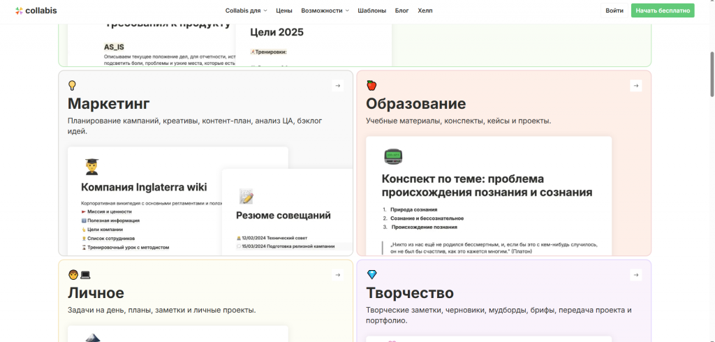 Collabis – сервис для ведения заметок с блочным редактором и встроенным AI-помощником. Он поможет структурировать лекции по предметам, выделить главное, может даже объяснить сложный термин или сгенерировать вопросы для самопроверки. Доступно в браузере, на Android и iOS. Бесплатный тариф позволяет хранить до 100 блокнотов.