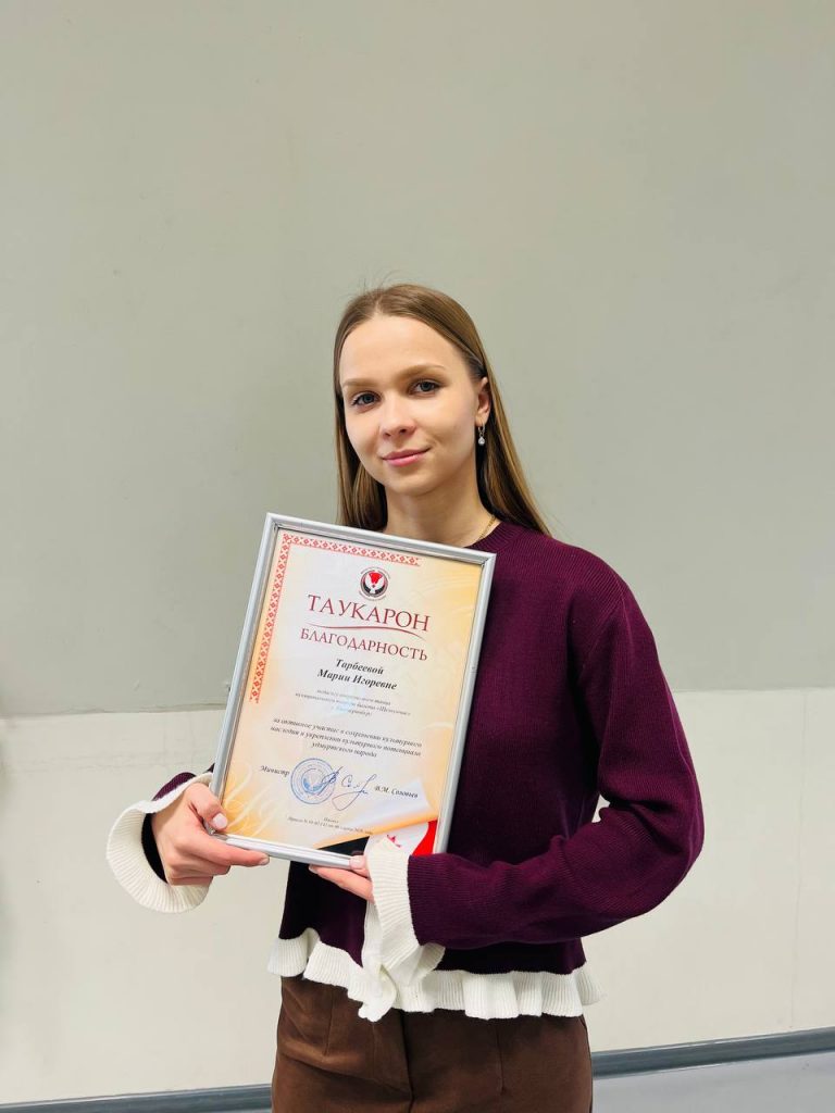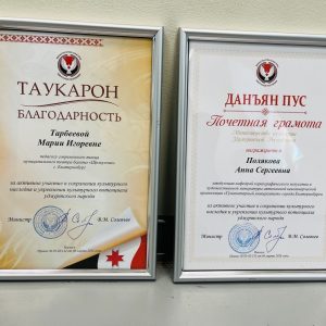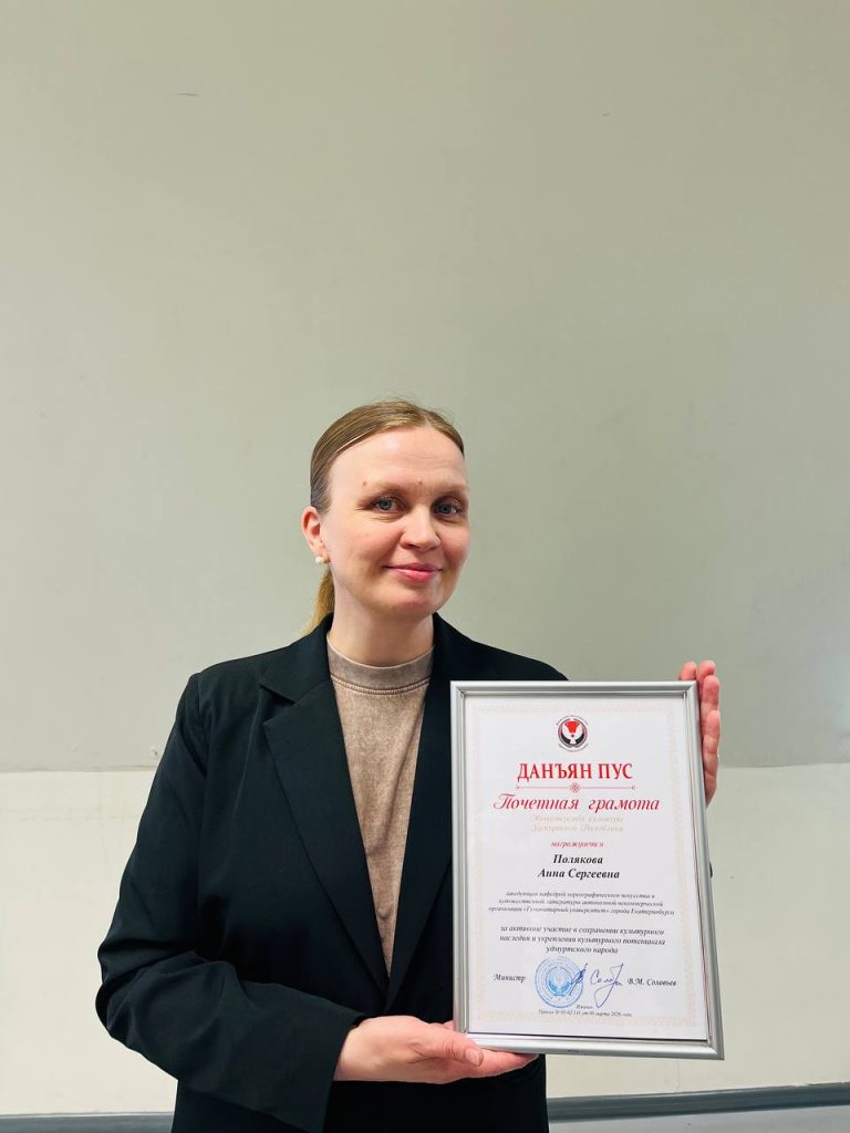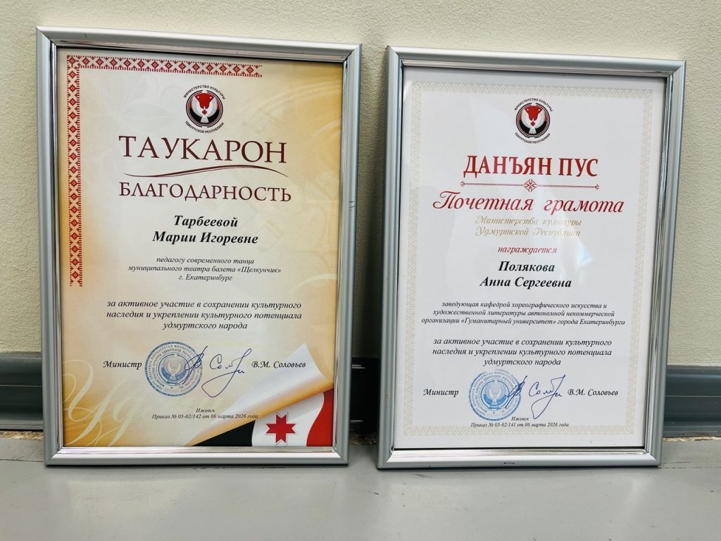 Заведующий кафедрой хореографического искусства и художественной культуры, канд. культурологии, доцент Анна Сергеевна Полякова и выпускница факультета современного танца (2022), лауреат всероссийских и международных конкурсов Мария Игоревна Тарбеева (вместе они – Танцевальная компания «Денница») отмечены Почетной грамотой и Благодарственным письмом Министра культуры Удмуртской Республики Владимира Михайловича Соловьева «За активное участие в сохранении культурного наследия и укреплении культурного потенциала удмуртского народа».